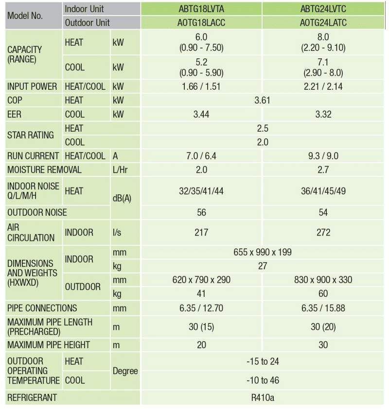 Despite powerful heating heating capacities, the Fujitsu High Capacity Floor Consoles are very efficient, with COP’s of 3.61 for both the 6kW and 8kW (heating) models.